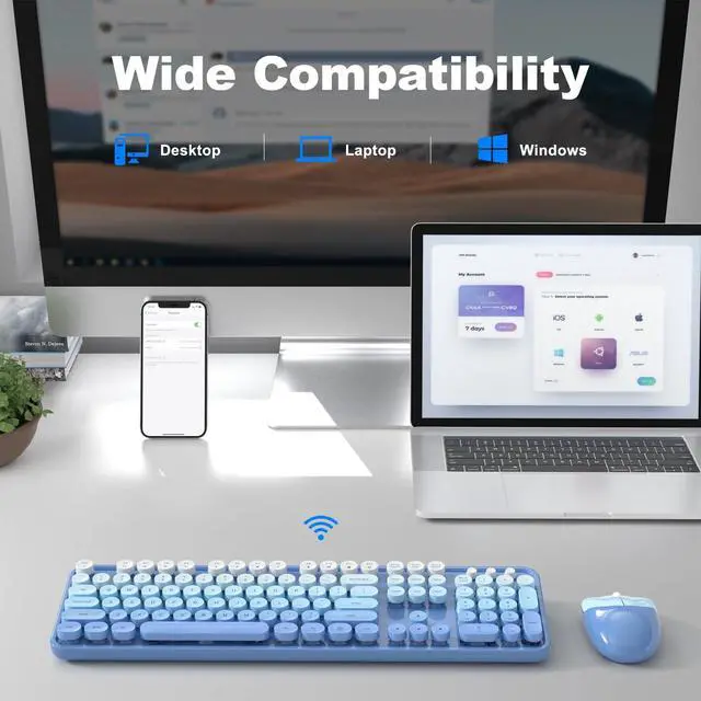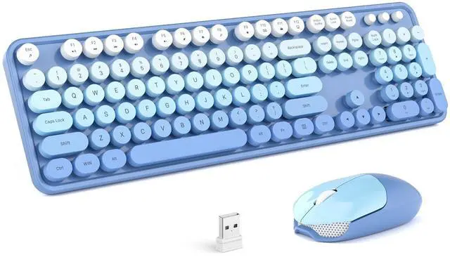 Fashion Multi-color Wireless keyboard and Mouse Combo- Enjoy Wireless Freedom. Stable wireless connection 2.4G wireless Keyboard and Mouse provides a powerful and reliable connection up to 10m (35 feet) no any delays. This wireless keyboard adopts a mixed-color design, using Laser printing, the letters on the keycaps will not easily blur or fall off. All 104 Keys non-conflict.