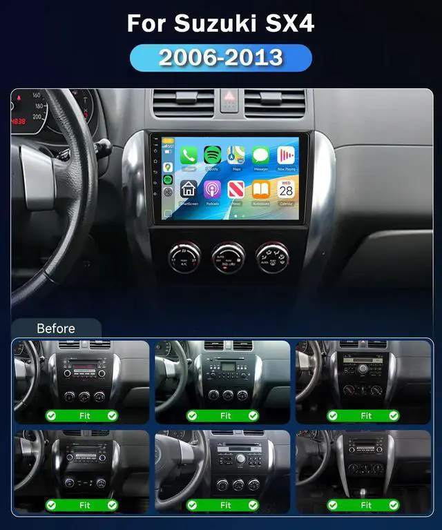 9-Inch with Snapdragon 8-Core 4+64GBFor Suzuki SX4 2006-2013 Car Stereo Experience the pinnacle of in-car entertainment with HD IPS touchscreen car stereo, powered by a robust 8-core processor and featuring 4GB RAM+64GB ROM. Android touch screen car stereo with resolution of 1280*720, while the scratch-resistant, Anki-knock, and high-temperature protection ensure durability. Enjoy a wide color gamut with Display P3/SRGB ^^ Wireless Carplay/Android AutoFor Suzuki SX4 carplay double din dash kit supports wireless Car Play/Android Auto/Mirror link connect, while WIFI and Bluetooth 5.1 ensure swift and stable connections, project the contents of your phone to the large car screen of the Suzuki SX4 car radio, and you can share your favorite videos, pictures, etc.