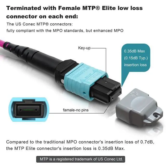 Equipped with US Conec Female (no pins) MTP Elite Connectors: MTP Elite fully compliant with the MPO standards, but offer better mechanical designs and optical performances.