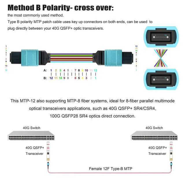 MTP/MPO-12 OM4 Trunk also supports MTP-8 fiber systems, make it ideal for 8-fiber parallel multimode optical transceiver applications, such as 40G QSFP+ SR4/CSR4, 100G QSFP28 SR4 optics direct connection.