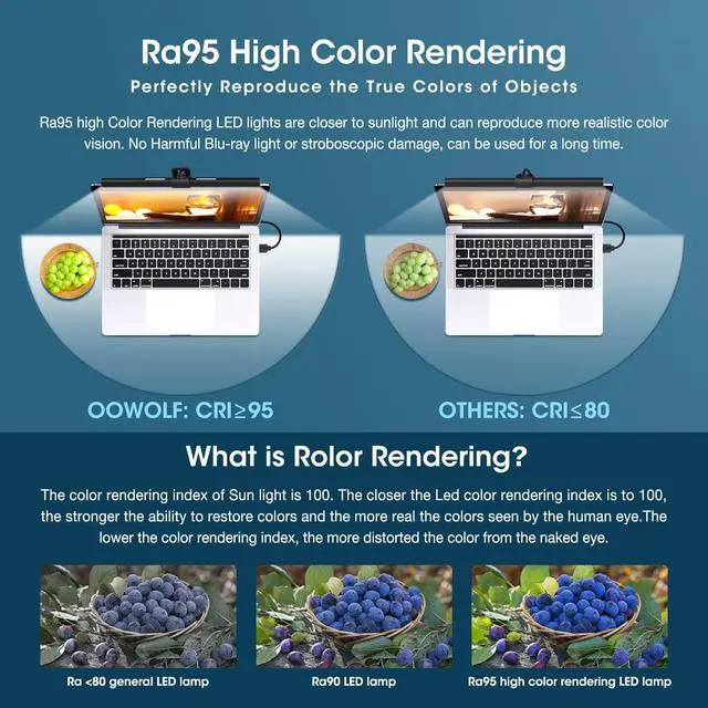 CRI95 &Highly Restore Color OOWOLF LED monitor lamp inspired computer users with its ultra-high color rendering index (CRI95) for precise lighting and excellent reading conditions. Extremely restoration of true natural light colors, reduce Color Error visual fatigue, this screenbar can great improve accuracy and efficiency of your work for long time. ^^ Backlight & Unique Design New TechCompared to other LED monitor lights that only have front lamps, OOWOLF LED screen lamp has New Technology for two special Rear Ambientlights to reduce pressure and irritation of the dark surroundings around the eyes, offer the highest level of lighting comfort when reading or working.