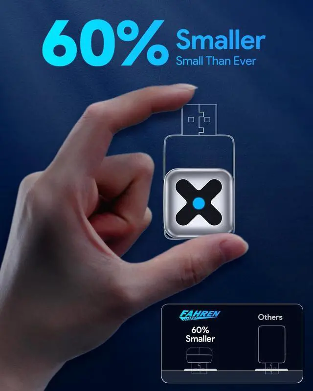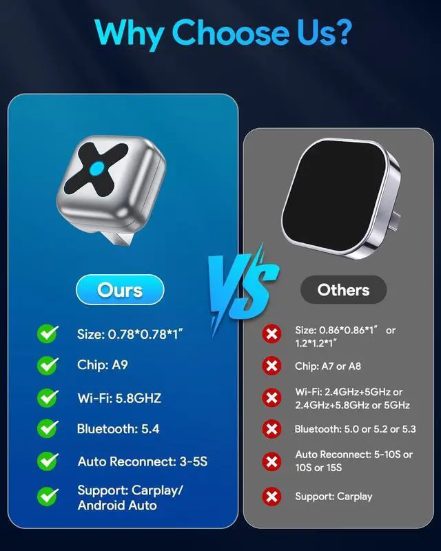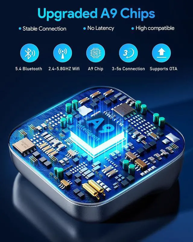 Next-Gen A9 Chip for Ultra-Fast, Lag-FreePowered by the latest A9 chip, this carplay wireless adapter delivers lightning-fast 3-5 second pairing with superior signal stability and zero delays. With the upgraded chip, it offers 200% faster speeds, no latency, and higher throughput, ensuring smooth and high-quality sound without interruptions. Enjoy a seamless connections for both CarPlay and Android Auto every time you step into your car. ^^ Miniature Size with Maximum ImpactMeasuring just 0.780. 780.98 inches, this thumb-sized android auto wireless adapter is over 60% smaller than traditional models, offering the most compact design.