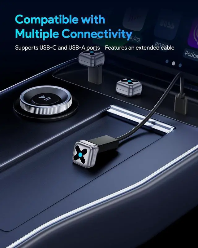 Its ultra-small footprint fits seamlessly into your car's interior, staying securely in place without any loose connections or wiggle. Transform your wired car play into a wireless experience, eliminating cable clutter. ^^ Seamless Connectivity with Wi-Fi & BluetoothExperience next-level connectivity with dual-mode support for 5.8GH z Wi-Fi and Bluetooth 5.4, this apple carplay wireless adapter ensures a lag-free, seamless experience every time. It supports USB-A extension cables, Type-C, making it compatible with a wide range of vehicles and devices. Additionally, it supports OTA updates for ongoing improvements and new features.
