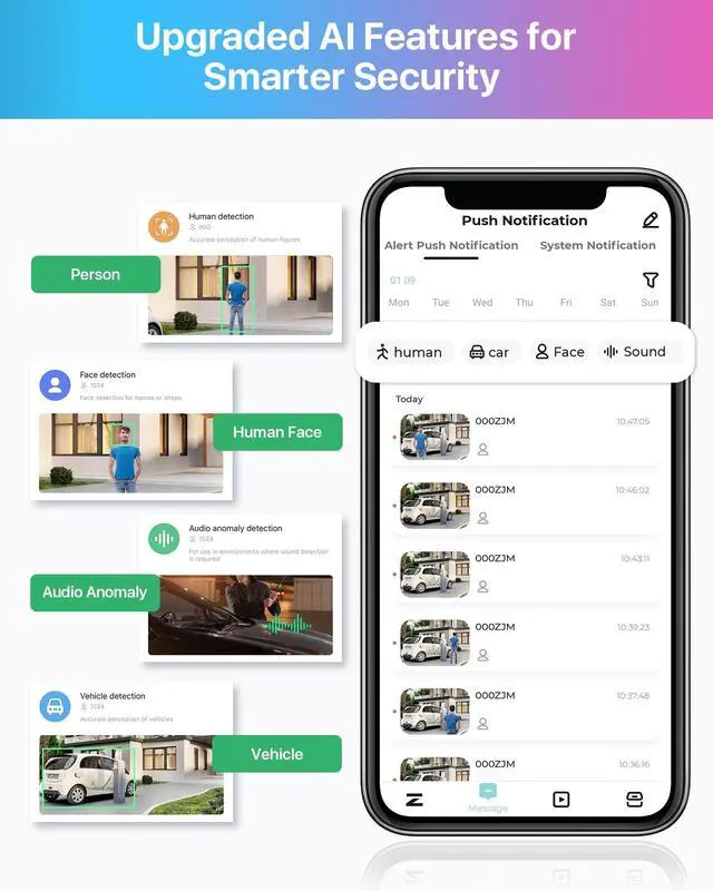 ^^ (3). [ AI Get Smarter Alerts that Matter ] __ Benefit from advanced AI detection capabilities, including face, people, vehicle, sound, pet, and package detection, significantly reducing false alarms. Additionally, the camera features an automatic sound and light alarm activation upon motion detection. ^^ (4). [ Two Way Audio ] __ Communicate conveniently using the built-in speaker and microphone, enabling seamless 2-way audio communication. ^^ (5). [ Plug & Play PoE Installation ] __ Utilizing power over Ethernet (PoE) technology, this outdoor bullet camera transmits video and receives power, signal, and data through a single network cable.