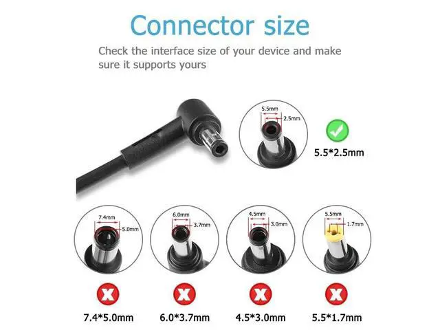 Connector size: 4.5 * 3.0 mm, Not Compatible with 5.5 mm* 2.5 mm.