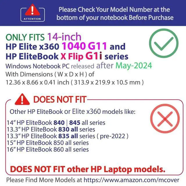 NOTE: Before placing order, PLEASE make sure to verify your laptop model number as this case is MODEL specific and NOT interchangeable. ^^ NOT fitting other 13", 14" & 15" HP Elite ( like Older 14-inch HP Elite x360 1040 G1 / G2 / G3 / G4 / G5 / G6 / G7 / G8 / G9 / G10 series laptops ) or EliteBook or PAVILION or ENVY laptops. NOT compatible with other HP laptops as well. ^^ Made of high-quality translucent polycarbonate material which is shatter-proof and will protect your 2024~2025 14" HP Elite x360 1040 G11 2-in-1 series Windows Laptop Computers ^^ Designed to ONLY fit the 2024~2025 14" HP Elite x360 1040 G11 2-in-1 series Windows Laptop Computers with dimension of 12.36 x 8.66 x 0.41 inch ( 313.9 x 219.9 x 10.5 mm ) ^^ 2-piece light-weight ( 8.3 oz or 235 g ) shell easily snaps on and off.