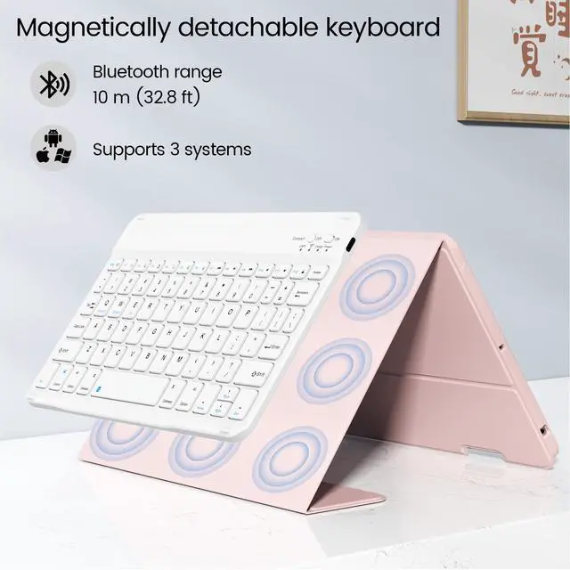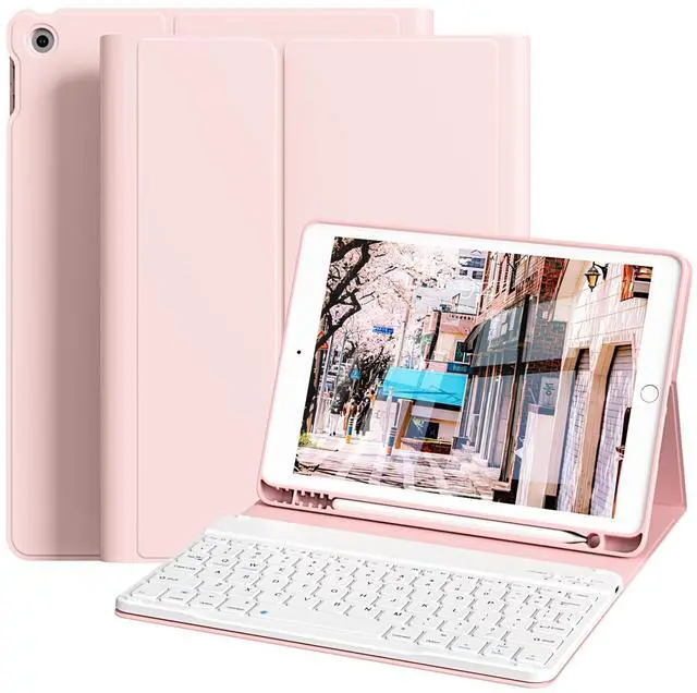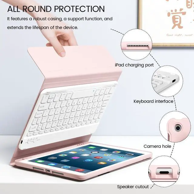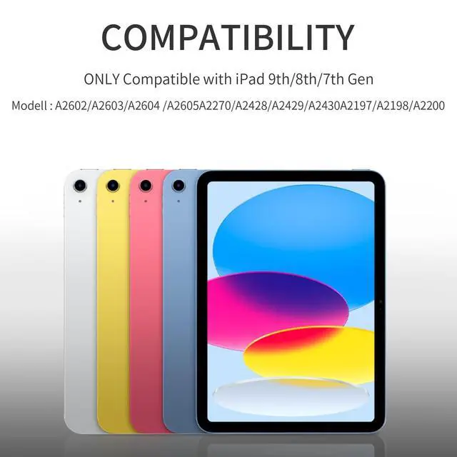 NOTE: Please check your model before purchasing, find the model number (AXXXX) at the bottom of the iPad back ^^ Magnetic Detachable Bluetooth KeyboardThis ipad 9th generation case with keyboard features a strong magnetic connection that allows for easy attachment or complete removal. The wireless connection is simple, fast, and stable. Equipped with useful shortcut keys and compatible with iOS, Windows, and Android operating systems, it offers ultimate convenience. greatly improved your iPad productivity. ^^ Rechargeable and Long-Lasting BatteryOur ipad keyboard 9th generation has a built-in 400mAh high-capacity battery, which is more energy-efficient and reduces power consumption. This ensures a usage time of at least 180 hours. It can be fully recharged in 2 hours with a Type-C charging cable, eliminating the need for battery replacement. ^^ Practical and PortableThis ipad 8th/7th generation case with keyboard includes a stylus holder. The cutout on the back makes it easy to remove the stylus for use. Adjust the viewing angle to your liking and prop up your tablet securely. Transform your iPad into a laptop in just one second perfect for studying, working, writing, drawing, reading, or watching videos.
