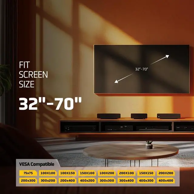 Universal Compatibility Our universal TV wall mount fits most 3270 inch flat screen and curved TVs, supporting up to 66 lbs. Compatible with VESA 75x75mm to 400x400mm, this wall mount TV bracket is designed for wood studs spaced 16 to 24 inches. Perfect for 55, 65, 70, or 75 inch TV wall mounts, it offers a secure and versatile solution for your home entertainment. The quick-release pull cords of this TV mount enable easy TV removal, making it ideal for adjustments, upgrades, or maintenance. ^^ Slim & Low Profile Design This ultra slim TV wall mount extends just 0.79 inches from the wall, creating a sleek, modern look that saves valuable space.
