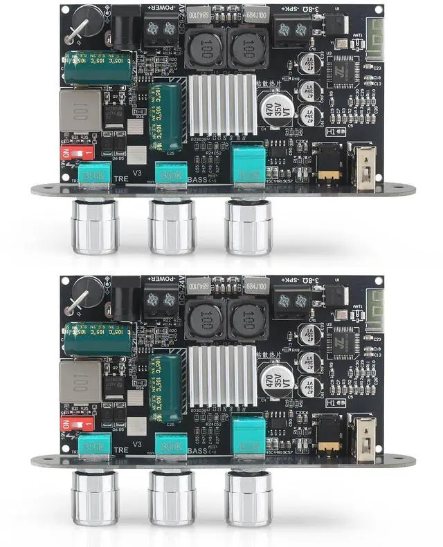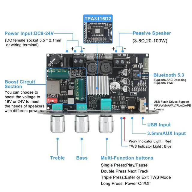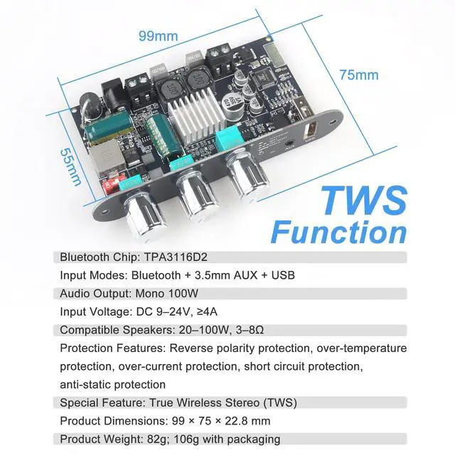 Effortless TWS Pairing for Wireless Stereo Sound Enjoy seamless True Wireless Stereo (TWS) pairingjust quick-press the multifunction knob to sync two amplifier boards for immersive left/right channel sound. Perfect for DIY speaker builds! ^^ High-Power Mono Amplifier with Genuine TPA3116 Chip Equipped with an authentic TPA3116 amplifier chip, this mono board delivers up to 100W output power and supports a wide 9-24V input voltage, making it ideal for robust audio projects. ^^ Built-In Boost Circuit for Optimal Voltage Output Features an auto-boosting circuit that intelligently adjusts input voltage (9V/15V) to a stable 19V or 24V (default: 24V), ensuring consistent high-performance audio even with lower-voltage batteries. ^^ Precision 3-Knob EQ Control + Smart Multifunction Button Three dedicated knobs for master volume, bass, and treble fine-tuning. The volume knob doubles as a smart button: Single