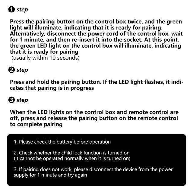 Noted1. Please check the battery before operation 2. Check whether the child lock function is turned on (it cannot be operated normally when it is turned on) 3. If pairing does not work, please disconnect the device from the power supply for 1 minute and try again