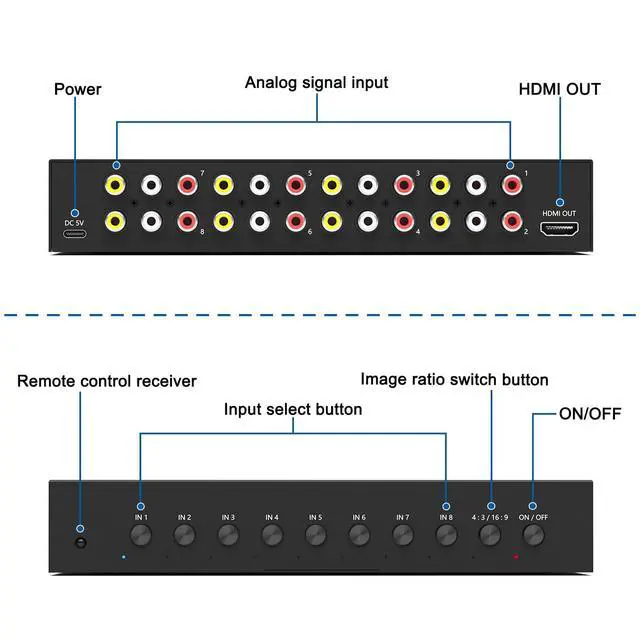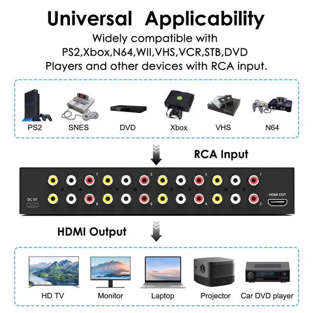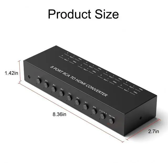 Converts analog RCA composite input to HDMI 720P/1080p (60Hz) output. The analog to digital conversion in this module employs 10 bits maximal 162MSPS sampling, which automatically detects and converts the composite signal to 1080p (60Hz) output, bringing your media to life with sharp and realistic HD picture quality. ^^ Easy to install, plug and play. Provide advanced signal processing with great precision, colors, resolutions, and details. Durable aluminum build makes for a longer lifespan. ^^ Universal applicability. 8 Port AV to HDMI Converter Compatible with Sega, WII, N64, NGC, SNES, PS1, PS2, PS3, Xbox, STB, VHS, VCR DVD Players, TV and Projector, etc.