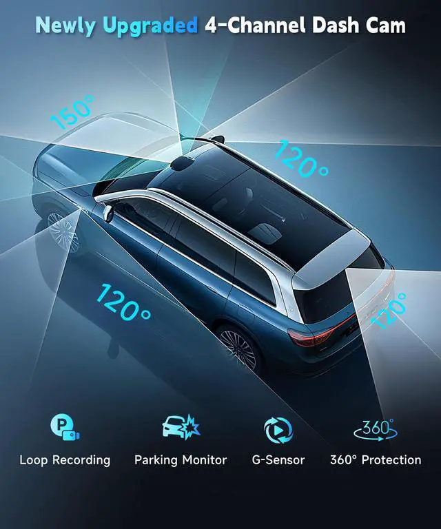 4-channel dash camera: The front camera offers a 150 wide-angle view, while the left, right, and rear cameras each provide 120 perspectives. This setup ensures no road detail is missed by our dashcam, you can view four screens at the same time ^^ Super