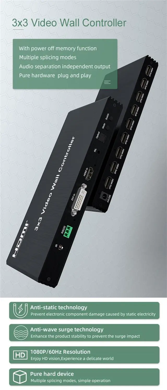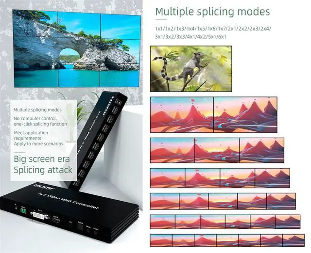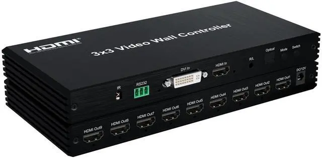 Features: * Support HDMI/DVI video source input; * Support 9-ways HDMI output; * With power off memory function; * Support multiple splicing modes, easy to handle, plug and play; Support RS232/IR control.