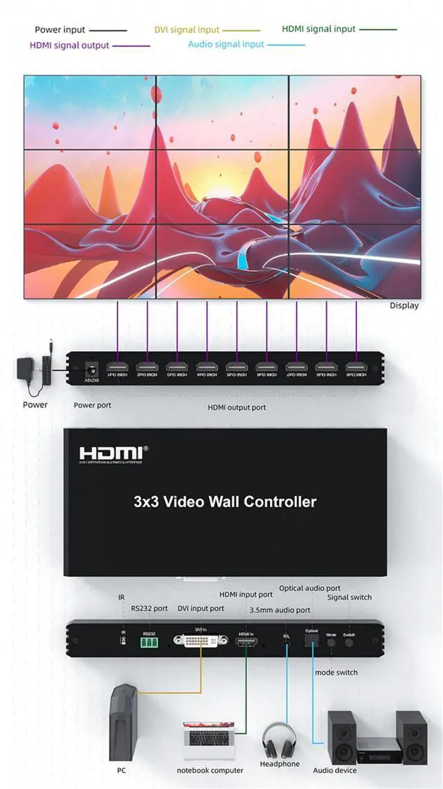 Package include: 1 x 3x3 Video Wall Controller1 x Remote contro1 x 12V DC power adaptor1 x User manual