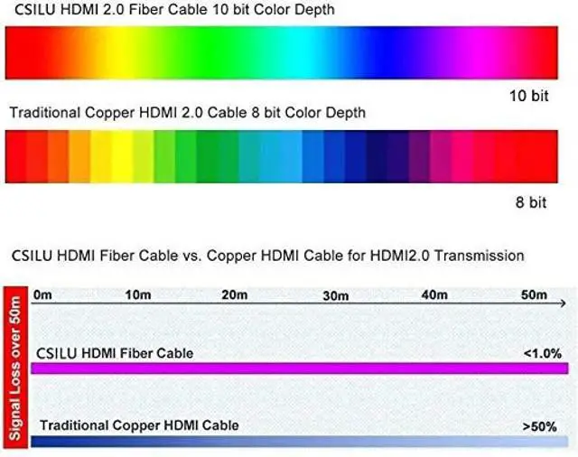 2Gbps Bandwidth High Speed: Long distance transmission at full 4k HDR 60Hz, The transmission rate of this HDMI 2.0 b fiber cable is higher than common HDMI copper cable, traditional HDMI copper cable can not OPTIMIZE 4K@60Hz HDR very well for long distance 50ft. ^^