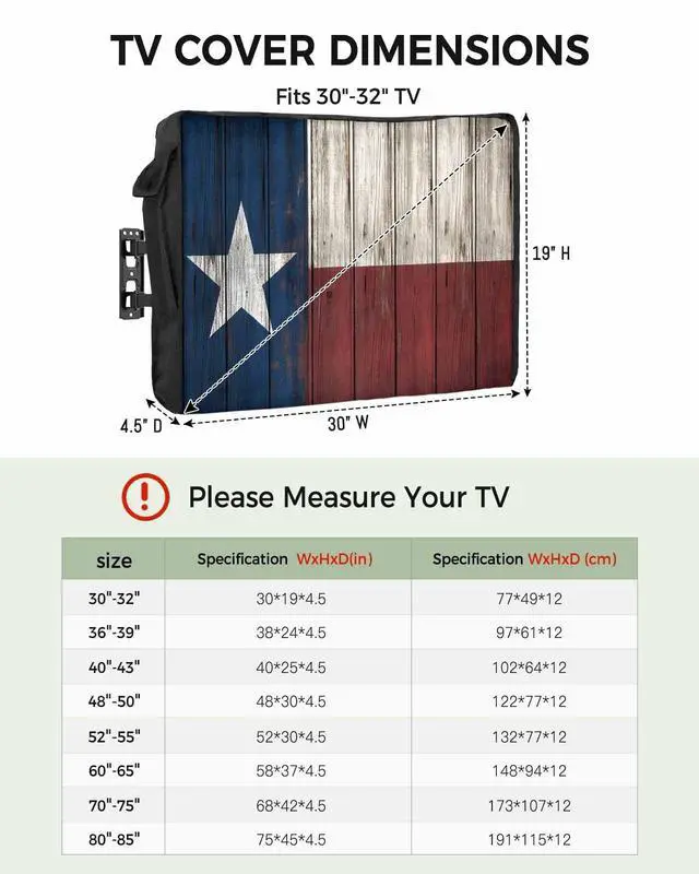 Protect your outdoor TV from adverse weather conditions such as wind, rain, snow, dust, etc. Provide 360 degree protection to extend the lifespan of outdoor televisions. Suitable for most general purpose TV wall mounting brackets, dual wall, single wall, and inclined TV brackets. The remote control pocket is convenient for storing the remote control. Machine washable, non bleachable, low temperature ironing! Protection from Sunlight UV radiation can be a major destructive factor for any equipment you keep outside. MaterialOxford ClothSize30"x19"x 4.5" for 30-32in TV38"x24"x 4.5" for 36-39in TV40"x25"x 4.5" for 40-43in TV48"x30"x 4.5" for 48-50in TV52"x30"x 4.5" for 52-55in TV58"x37"x 4.5" for 60-65in TV68"x42"x 4.5" for 70-75in TV75"x45"x 4.5" for 80-85in