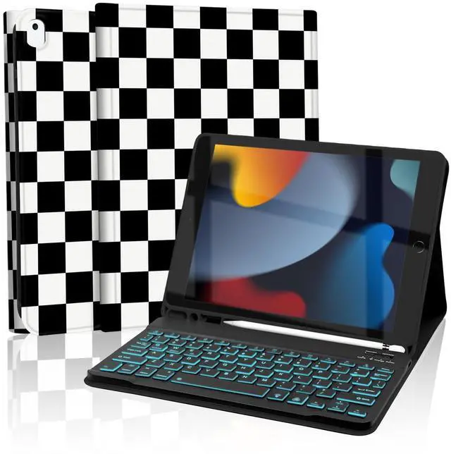Mewealth Keyboard Case for iPad 9th / 8th / 7th Generation 10.2 Inch with Pencil Holder, Backlights LED Keyboard Cover for iPad Pro 10.5" / iPad Air 3rd, Checkered Plaid White-Black
