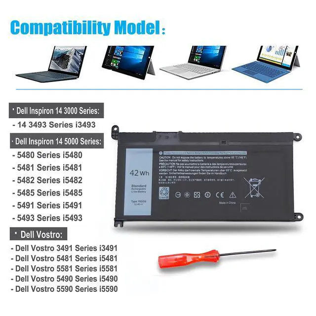 Cells: 3-cells; with Free Screwdriver ^^ COMPATIBILITY - Dell Inspiron 14 15 17 3493 3501 5480 5481 5482 5485 5491 5493 3582 3583 3593 5584 5585 5590 5591 5593 5594 5598 7586 3793 7586 Latitude 3310 Vostro 3491 5481 5581 5490 5590i3493 i3501 i5480 i5481 i5482 i5485 i5491 i5493 i3582 i3583 i3593 i5584 i5585 i5590 i5591 i5593 i5594 i5598 i7586 i3793 i7586 i3310 i3491 i5481 i5581 i5490 i5590 ^^ Replacement Part NumberYRDD6 0YRDD6 1VX1H 01VX1H VM732 0VM732 ^^ More ConvenienceMost conveniently, we provide the Screwdriver in the package. You dont need to find or buy screwdriver in addition. You can just use our BURFLO Screwdriver to Remove and install all the screws faster, which save your time and money. Choose our product which make you feel more convenience and faster.