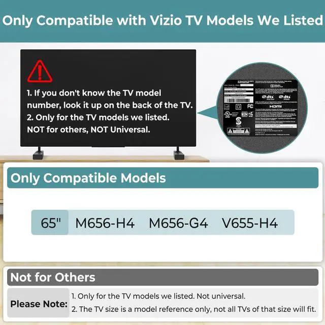 Please Note: Not Compatible with Other size or model of TV, The TV size is a model reference only, not all TVs of that size will fit. TV Stand Legs Only Compatible with Vizio Smart TV Legs We ListedOnly compatible with Vizio M656-H4 M-Series Quantum 65" Class 4K HDR Smart TVOnly compatible with Vizio M656-G4 65" Class 4K (2160P) Smart LED TVOnly compatible with Vizio V655-h4 65" Class 4K (2160P)