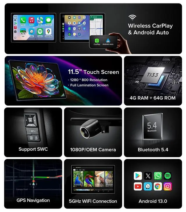 Supports Google, Facebook, TikTok, YouTube, with 11.5 inch Touch screen, you can better control this machineand offers multiple UI themes for a personalized user experience ^^ More advanced features Supports 5G Wi Fi, Bluetooth 5.4, AM/FM radio, GPS, and navigation. Enjoy hands-free calling, phonebook synchronization, and music streaming. Connecting to Wi-Fi allows access to online maps, videos, music, and other applications, enhancing your driving experience ^^ 1080P AHD Backup CameraIncludes AHD 1080P rear cam (IP69 rated). Automatically display clear reverse image after shifting into reverse gear to ensure safer parking.