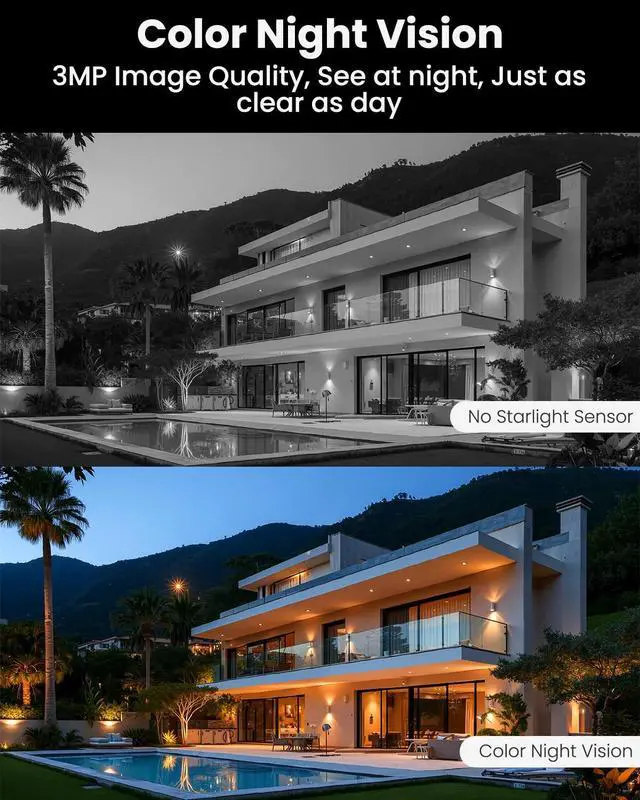 : Mubview cameras for home security captures crystal-clear 2K (23041296P) images and videos, day or night. With color night vision and a monitoring distance of up to 55 feet, you'll never miss a thing.