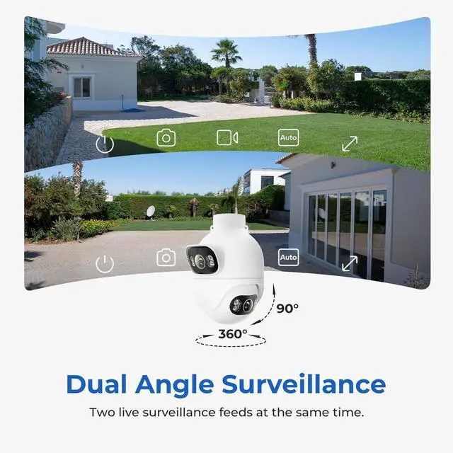 Dual-Lens 360 Coverage, One Camera Replaces TwoUnlike standard outdoor cameras, the EC6 Dual 3K+3K wired outdoor camera features two built-in lenses that monitor two directions at once. The lower lens automatically rotates and tracks people when motion is detected, delivering true 360 coverage with no blind spots, ideal for yards, driveways, and entrances. ^^ True 3K+3K Clarity with Smart Color Night VisionEach lens delivers sharp 3K resolution, giving you two clear live views at the same time. Smart color night vision activates only when needed, helping you clearly identify faces, vehicles, and activity at night while reducing unnecessary power usage.