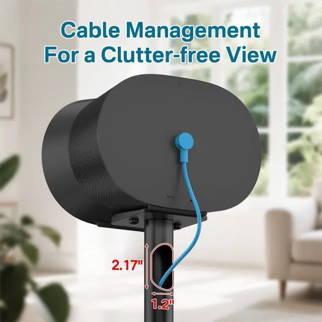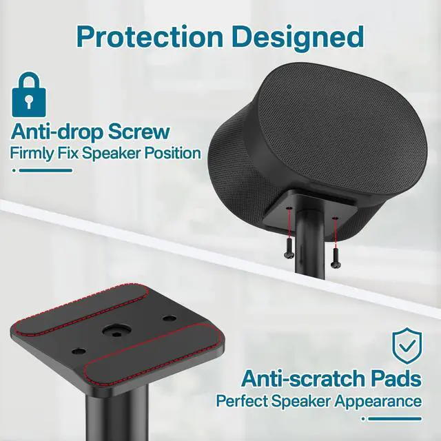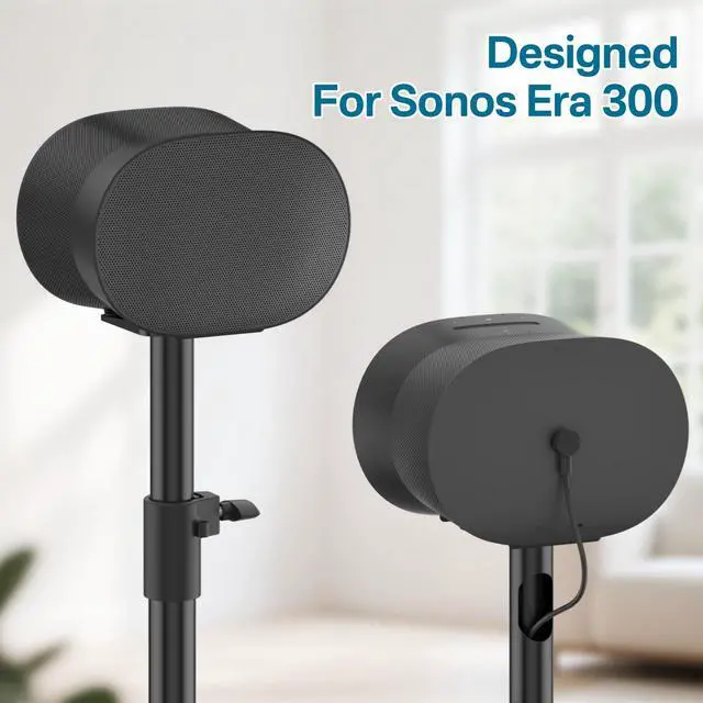 Whether you're sitting or standing, the adjustable speaker stand helps create immersive audio in any listening environment. ^^ Built-in Cable Management System - The integrated cable routing system hides unsightly wires inside the speaker pole for a clean, minimalist setup. Keep your entertainment area clutter-free while maintaining full functionality of your Sonos Era 300 speaker stand. ^^ Scratch-Resistant Design - The speaker stand for Sonos Era 300 floor stand equipped with silicone pads for anti-scratch protection, prevents damage to your speaker's base that keep your speaker perfect appearance. ^^ Heavy-Duty Metal Construction - Crafted from premium-grade steel with a sleek matte finish, this heavy-duty speaker stand supports up to 30 lbs while complementing your home decor.