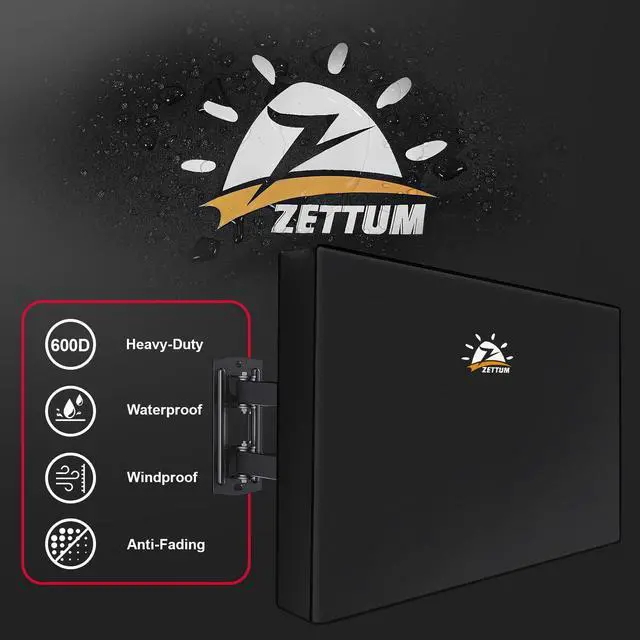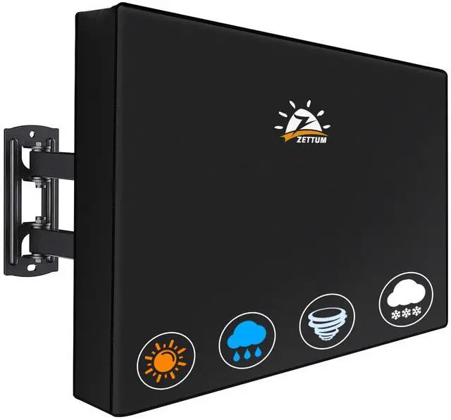 Zettum will be the tough protector of your outdoor TV! ^^ ^^ Fit All TV Mounts with Remote Control Pocket ^^ - Upgrade adjustable velcro design making the cover secure to the TV super tightly, no wind can blow away Zettum TV covers! Fit most universal TV wall mount brackets like double wall mount, single wall mount, and tilting TV mount. The additional remote control pocket design will protect your TV remote control all day. ^^ ^^ Fading-Resistant Cover for Years ^^ - UV Test can reproduce the damage caused by sunlight, rain, and dew through the equipment.