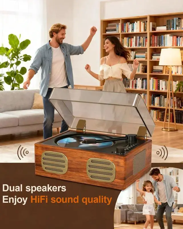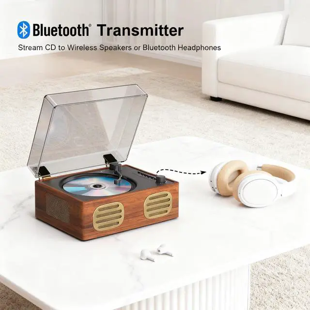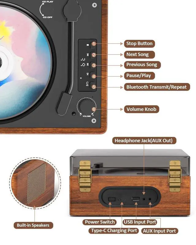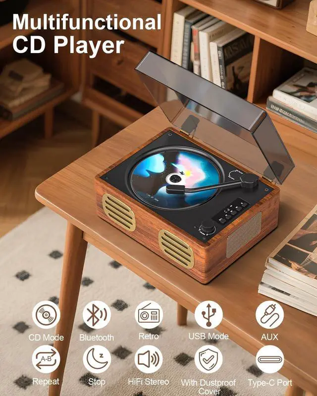 ^^ EASY OPERATION: LED screen display provides clear visibility of playback information and settings for enhanced user experience. HI-FI ACOUSTICS & STABILITY Features an independent sound chamber and high-performance speaker unit. it provides 75% more sound detail than ordinary speakers, and bass boosted by 60% via aerodynamic membrane. voice much more pure and the background sound more clear. You can enjoy theater-quality music at home. Botton Equipped 4 soft anti-slip pads prevent vibration ^^ Vintage Decor - RETRO-REFINED DESIGN Adorned with PU wood-grain leather and gold hardware, this CD player elevates your space with sophisticated vintage charm. Perfect for unwinding with favorite tunes after a long day. it is Vintage Home Artwork. ^^ BATTERY PROTECTION & WARRANTY-Auto-shutdown after 15 mins of inactivity, Always switch to "OFF" when not in use/charging. if you need to restart it, turn the switch to "OFF" for 5-10 seconds. Comes with 1-year warranty + 24/7 dedicated support. Ideal Gift Vintage BT CD player for music lovers. (No remote control)