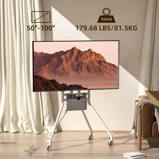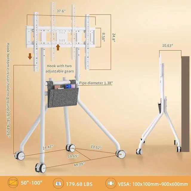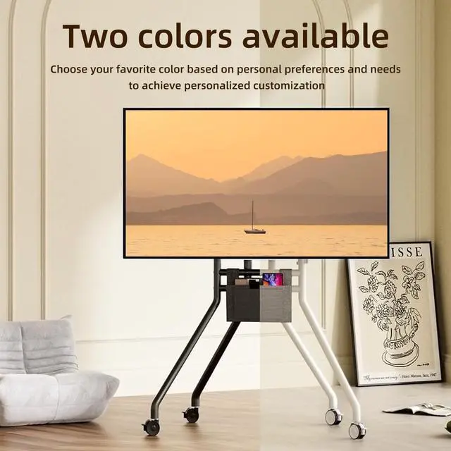 Durable: This rack mounted TV stand is made of cold-rolled steel and is durable. Rounded corners help prevent accidental collisions and protect the safety of family members. Equipped with a storage bag, it can hold small and easily accessible items such as remote controls. Artistic design to enhance your daily life experience ^^ VersatileThis rolling TV stand is absolutely an innovation in TV mounting. Perfect for those who have tight quarters and dont want their TV dominate the room. For those with spacious living space, its bravo too as you can move it room to room. Ideal mobile monitor display choice for workout room, office, school, shopping mall, airport, etc.