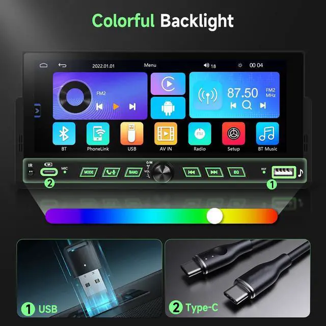 Colorful Backlight: Enhanced Connectivity and StyleThis single din touch screen head unit boasts USB and Type-C ports for versatile charging and data transfer, ensuring compatibility with a wide range of devices. The colorful backlight enhances visibility in low-light conditions while adding a stylish touch to your car's interior. With these features, this single din touchscreen audio receiver combines functionality and aesthetics for an enhanced driving experience.