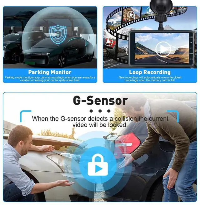 Parking Monitor & G-sensor: The backup camera for car dashboard can monitor your car condition for 24 hours with continuous power supply. Parking mode monitors your cars surroundings when you are away for a vacation or leaving your car for quite some time. The G-sensor with auto collision detection will detect impacts and lock important video segments to the emergency files folder and prevent overwriting of your video file