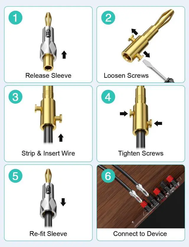 Convenient LinkageEMK speaker banana plugs offer a steadfast and dependable means to link speaker wires with amplifiers, receivers, and other audio gear. ^^ Easy Set-up Just peel off the wire insulation, slot it into the plug, and screw it tight for a precise fit. ^^ Versatile Adaptability These plugs are crafted to be compatible with a vast assortment of audio cables and apparatus, rendering them a flexible option. ^^ Robust FabricationConstructed from top-notch materials, banana plugs are engineered to endure frequent utilization and deliver enduring efficacy. ^^ Enhanced Signal Transmission By guaranteeing a firm connection, banana plugs assist in reducing signal attenuation and disturbance, leading to superior acoustic quality.