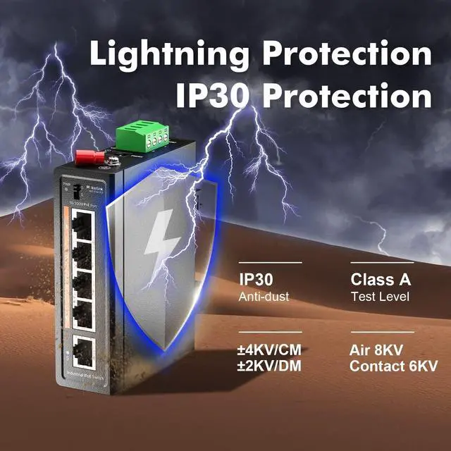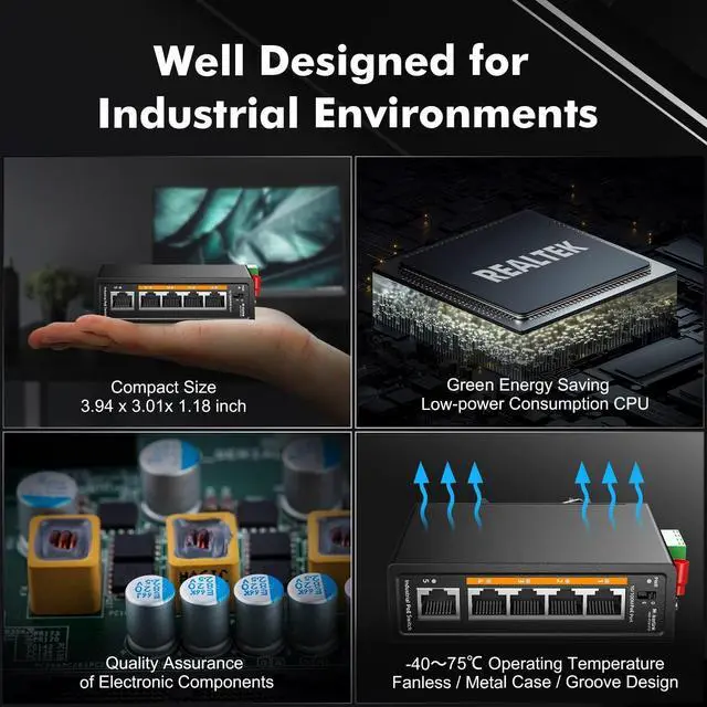 This network switch include 4 port PoE ports, 1 port uplink, support 10/100Mbps adaptive, compliant with IEEE 802.3, IEEE 802.3 u, IEEE 802.3 x ethernet standards ^^ The poe port 1-4 support IEEE 802.3 af/at standard, max 30W per port, can connect multiple poe devices, such as POE camera, poe ap, etc. Please note that passive 24v poe is not supported. His POE input DC voltage is 48-55V, so please use a input voltage above 48V to provide POE, if it is 12V, it cannot provide POE ^^ The shell is made of industrial-grade aluminum alloy, which is more sturdy, compact design and small size, integrated DIN-rail and wall mount kit, installation and disassembly are very simple ^^ IP30 protection grade, working temperature -40~75C(-40~185F), super robustness, anti-lightning, anti-static and anti-overload protection, adapt to various harsh environments ^^ 1 DC Power and 2 Industrial power (4 pin terminal), total of 3-way power supply is more flexible.