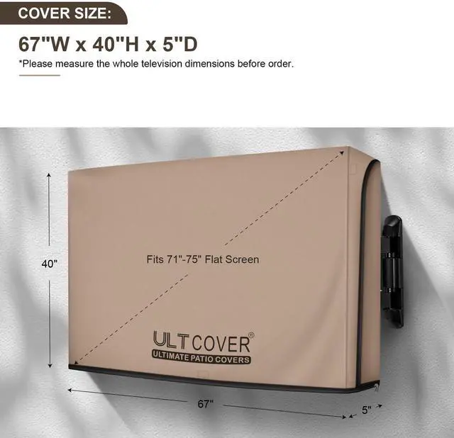 Fits flat screen tv with cables size up to 67 (W) x40 (H) x5 (D). ^^ Made of 600D polyester tear resistance fabric complex with An-ti UV coating & waterproof coating. Tough enough to keep rain, hail, snow, dust away. ^^ TPU clear front flap protects your TV from dust while allowing you to watch without removing it. ^^ The slots on the cover are compatible with several styles of wall/ceiling mounts and stands, with hook-and-loop systems and flap fastener. Theres also adequate space to fit any wires or cables that may be tucked behind the TV as well.