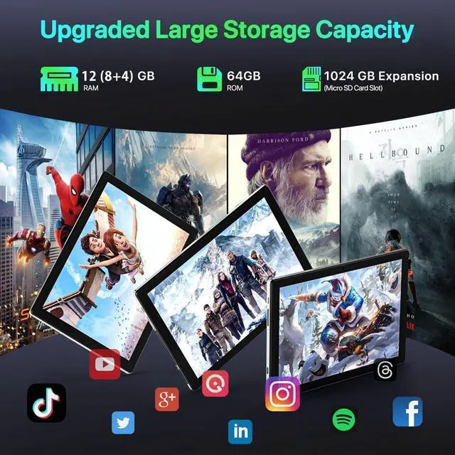 ^^ The 10.2 -inch HD IPS screen delivers amazing picture quality with vivid colors, perfect for movies and e-books. Dual stereo speakers provide rich sound. It's an ideal family tablet for shared entertainment, with front and rear cameras that handle video calls smoothly and built-in parental controls for peace of mind. ^^ Never worry about space with 64GB of internal storage, expandable up to 1TB via a microSD card. It offers so much storage for apps, photos, videos, and documents, making it perfect for students and as a cost-effective upgrade from smaller, storage-limited devices.