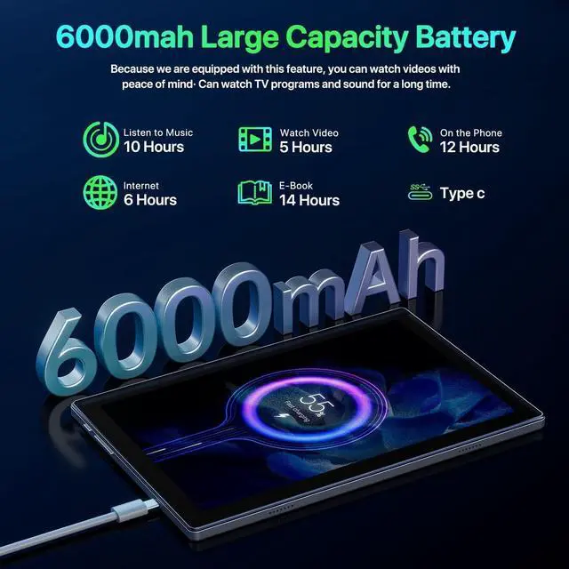 Experience smooth, lag-free performance for everyday tasks, browsing, and multitasking, powered by an advanced octa-core processor and a massive 12GB of RAM that's more RAM than many budget tablets, including some Fire HD models. Coupled with the latest Android 14 and full Google Play Store access, it offers a complete and up-to-date ecosystem for all your apps and games. ^^ Enjoy all-day battery life (8-12 hours) for streaming, classes, or work with the high-capacity 6000mAh battery. Stay reliably connected with stable dual-band WiFi ( 2.4G /5G) and WiFi 6, ensuring fast downloads and buffer-free video callsa feature customers specifically praise for its reliability.