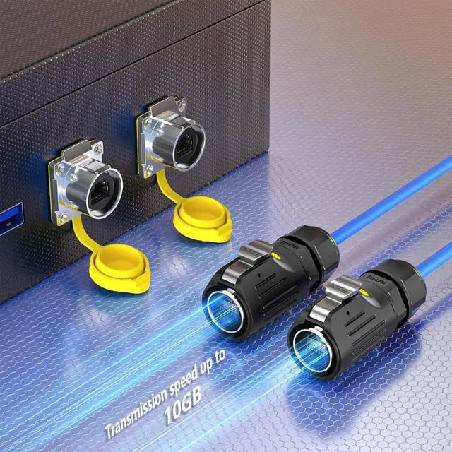 IP68 Waterproof Cat7 RJ45 Aviation Plugs SocketsData transmission is performed using 10GBASE-T (10GBASE-T or IEEE 802.3 an-2006 standard. It can transmit data at 10 Gbps over shielded or unshielded twisted-pair cables). 1. Extend the Length of Your Outdoor Ethernet CableWith our IP68 ethernet couplers, there is no need to purchase another longer network cord anymore. The inline coupler performs the perfect connection between all of the wires in each cable. It is more cost-effective and time-saving than swapping-out short cables for longer ones. 2. Metal Shield No Signal LossPure copper plated tentacles ensure strong signal transmission and high-speed performance.