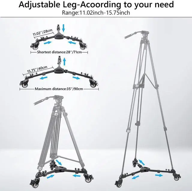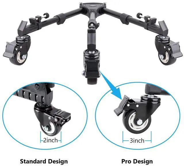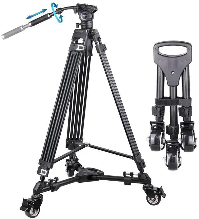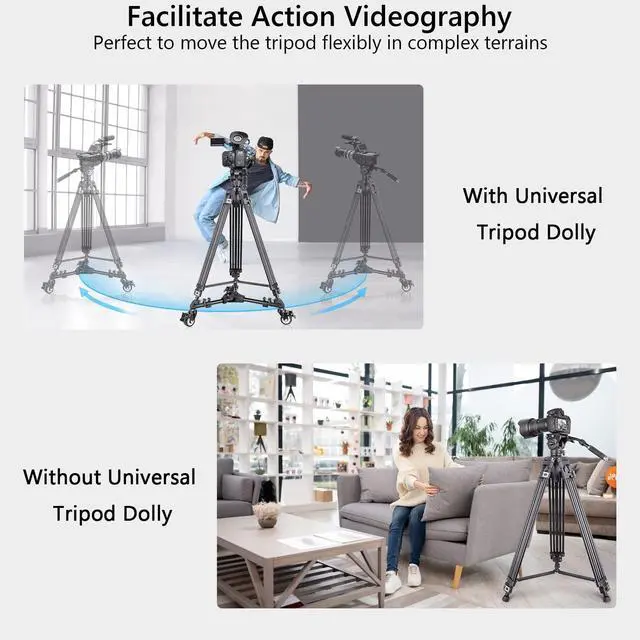 Video Tripod with DollyThe MF70 heavy-duty video tripod with Dolly is a new design of the traditional tripod, making it easier to use. Tripod Dolly Easy Movement - Enjoy silent motion and glide throughout your shoot with ease. The solid 3 rubber wheels make maneuvering the trolley quiet and effortless.