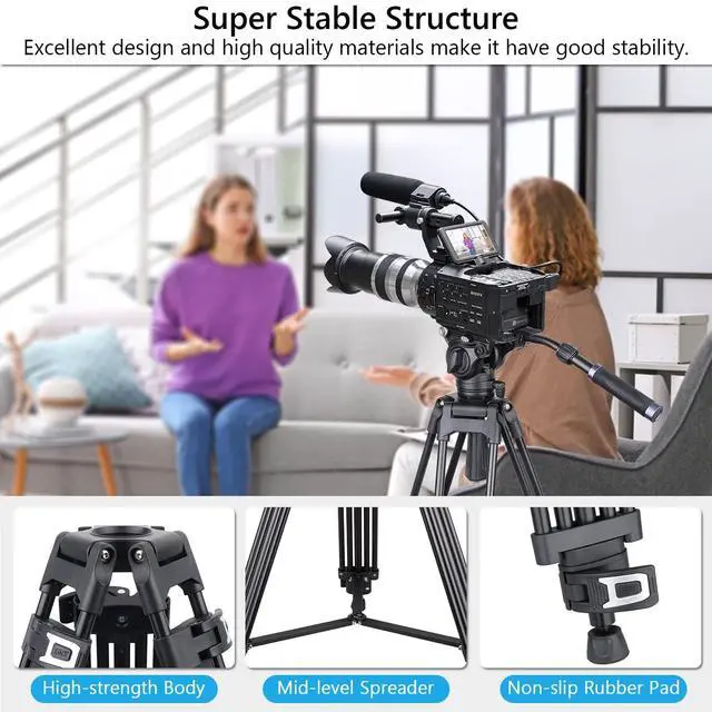 Rock SolidThis video tripod is made of High-strengthquality aluminum alloy, Its max leg tube diameter is as large as 0.7inch and minimum is 0.55inch, the max load is 20 Pounds, max height is 72.8 inch. This tripod comes with a locking mid-level spreader for extra support. It is ideal for large cameras and professional camcorders.Professional Fluid video HeadThis video fluid head is made of all-metal, firm and stable. Support adjustable angel, pan 360 degree, Pitch angle -52 degree~ 90 degree.With 1/4 and spare 3/8 screw, perfect for most brands of the cameras and camcorders.A safety button on the left side of fluid head avoids equipment falling down.