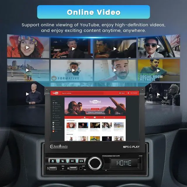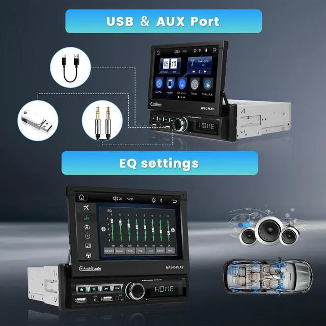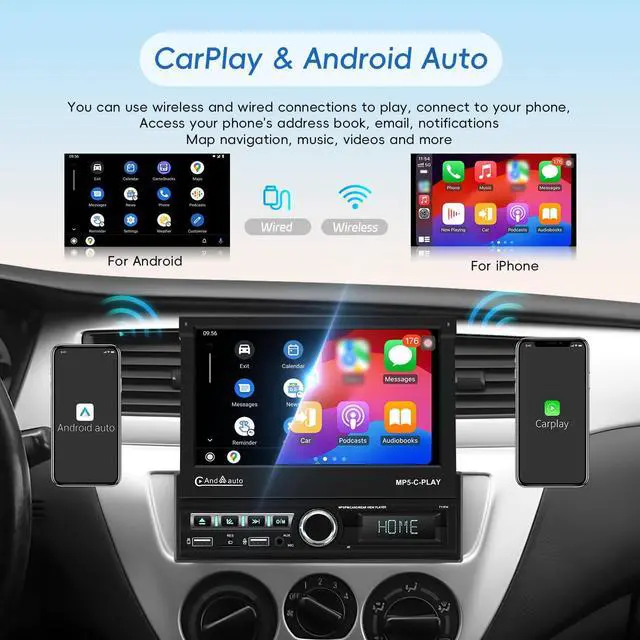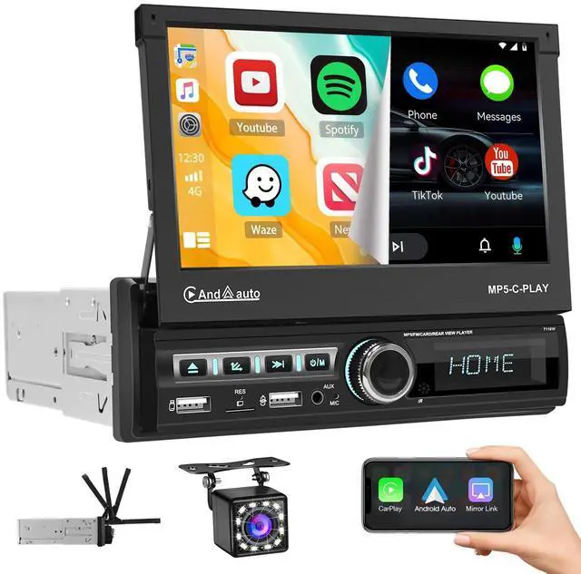 7 Inch HD Flip Out TouchscreenThe standard installation size of single din car radio: 7.4" (L) * 6.2" (H) * 7.7" (W) inch. Support USB input(for Wired Carplay/Android Auto, Flash drive, Mirror Link, phone fast charging), TF Card Port (supports 32GB), AUX, various playback methods. This motorized retractable screen supports button control. Simply press and hold the first button from left to right to control the angle of the screen, or press and hold the second button from left to right to control the screen's expansion ^^ Wireless/Wired Carplay Android Auto Mirror LinkAccess your phone's contacts, notifications, map navigation, music, videos, and more via Bluetooth using wireless Carplay Android Auto or a universal USB connection using wired Carplay Android Auto. It also has a built-in Mirror Link feature. You can share your phone's content with your family on the single din touchscreen ^^ Online VideoThis single din motorized car dash kit supports watching YouTube online, enjoying HD videos, and enjoying great content anytime, anywhere ^^ Bluetooth & FM & EQOur single din car stereo with bluetooth, support hands-free calling, phonebook download and music playback. You can listen to real-time traffic, news broadcasts, weather forecasts, and more with the FM feature.
