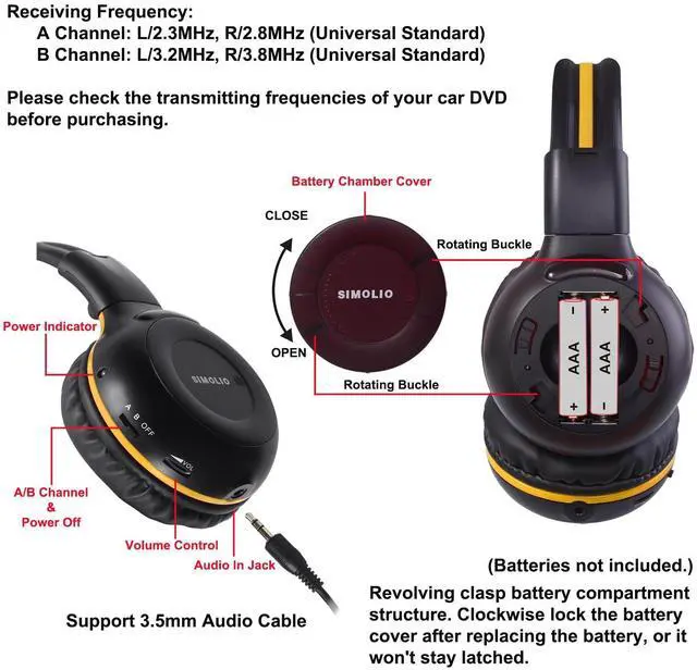 FIG 2 or Product Description). ^^ SIMOLIO Two Channel Wireless IR Headphones Work with Honda Ridgeline2006 2007 2008 2009 2010 2011 2012 2013 2014 2015 2016 2017 2018 2019 2020 2021 2022 2023. These can allow two kids at the same row watching different movies from headrest DVD players without interference by switching to A/B channel. If you installed a ceiling/roof mounted DVD player for all the people in different rows to watch the same program, suggest you to choose CH A for your DVD and headphone which have better performance. ^^ SIMOLIO Wireless Replacement Car DVD Headphones work on Honda RDX 2006 2007 2008 2009 2010 2011 2012 2013 2014 2015 2016 2017 2018 2019 2020 & Honda MDX 2003 2004 2005 2006 2007 2008 2009 2010 2011 2012 2013 2014 2015 2016 2017 2018 2019 2020 2021 2022 2023. Power Saving IR Headphones with Custom EVA case for Easy Storage. Automatic shut off prevents batteries from draining when left on to ensure maximum battery life. A 3.5 mm Aux cable included, for use with iPad, iPhone and Tablet PC etc.