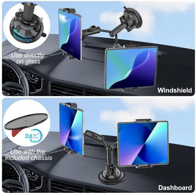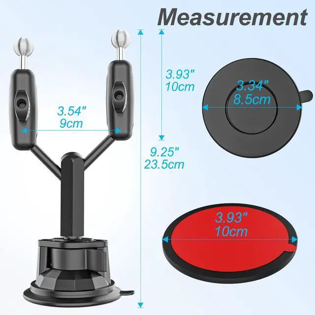 Dual-head design and durableEquipped with adjustable arms, it can support two devices at the same time, which is ideal for multitasking. The reinforced threaded metal ball head is wear-resistant and ensures stable support without breaking. Whether it is navigation or entertainment, you can switch between devices seamlessly. ^^ 360 fully adjustableSmooth 360 rotation and tilt flexibility can precisely customize the angle without blocking your driving vision. The button lock design allows you to easily rotate the bracket horizontally or vertically to perfectly adjust the screen position in any situation. ^^ Multiple ways to use to meet different needsCan be used directly on the car windshield or car sunroof.