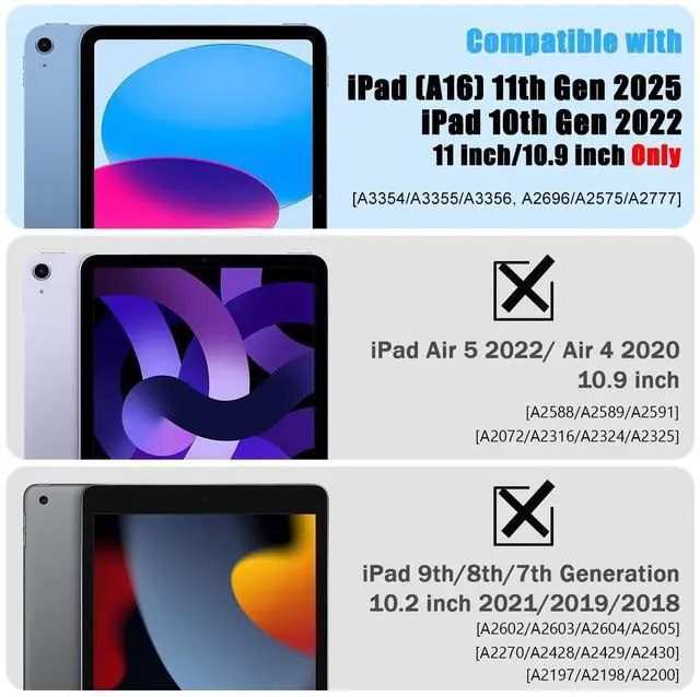 Model: A3354, A3355, A3356, A2696, A2757, A2777. NOT fits other Generations iPad. Please check your iPad model on the back bottom to confirm the "AXXXX" model number before purchasing. ^^ [Military-Grade Rugged & Scratch Resistant Protection] Advanced 3 in 1 construction with solid premium PC (added inner TPU impact-absorbing strip) and shock-absorbing silicone material offers comprehensive protection for your iPad a16 11th gen 11-inch / 10th gen 10.9 -inch, in addition, raised edges and four corner cushioning pads prevents it from accidental drop, shock, skid and scratch. (Screen Protector Not Included). ^^ [Amazing 360Rotating + 180Foldable Hand Grip & Kickstand Function] Dual-mode stand with 360turntable supports portrait/landscape switching during movies, e-books, or digital art. The 180foldable design lies completely flat when not in use or locks at any angle for optimal typing and drawing. Unique ring hook design attaches to any wall/headboard/workspace (no magnets required) to reduce neck strain. Features 3-stage damping for sturdy support at every angle with zero wobble during use. ^^ [Pencil Holder & Precise Cutouts] Integrated elastic pencil holder securely stores your Pencil (Apple Pencil Not Included).