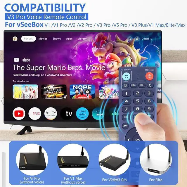 Multi-Device Compatibility: This V3 Pro Voice Remote is compatible with vSeeBox select models, including vSeeBox V5 Pro, V3 Plus, V3 Pro, V2, V2 Pro, V1, V1 Pro, V1 Max, Elite, Max.