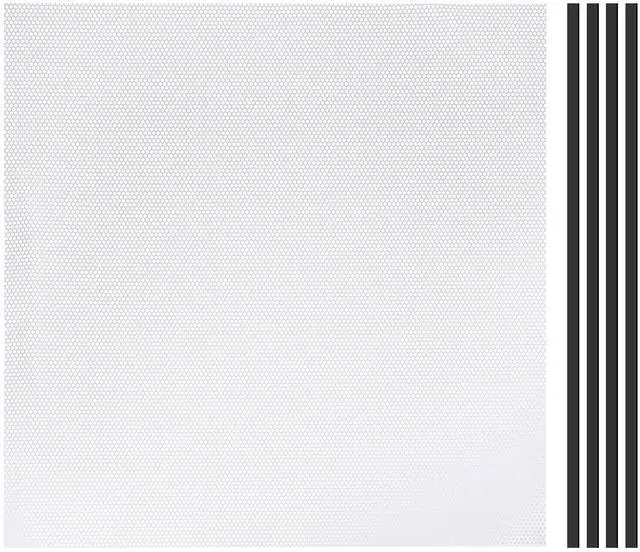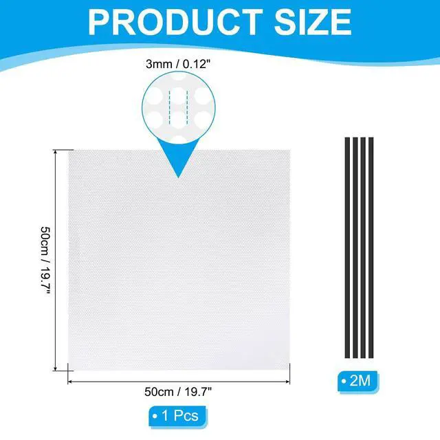 List: 1 x PC Fan Dust Mesh and 2M x Magnetic Strip and 1 x Scissors and 1 x Utility knifeAdvantageMade of PVC material, the PC fan dust filter is lightweight, flexible with good toughness, bendable, and can withstand high temperatures without deformation for durability. Fine hole design provides efficient dustproof capabilities, maintaining proper airflow for ventilation and keeping the computer components clean to prevent it from overheating and extend the components' lifespan. InstructionNo need for holes; simply stick the magnetic strip around the edges of the dust filter, allowing it to adhere magnetically to the metal case. This makes it easy to remove and clean, saving you time. NOTE