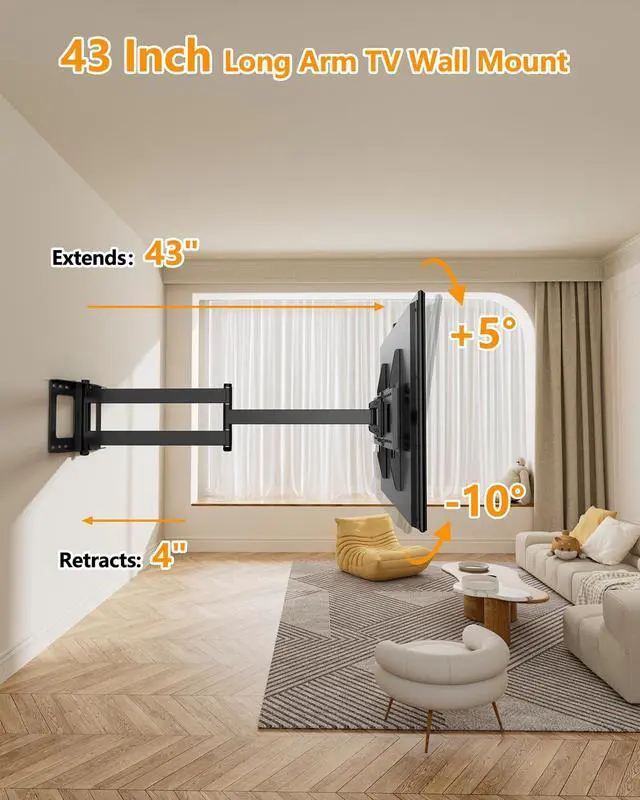 ^^ Full Adjustment: Full motion, Extends, tilt, articulates, swivels, levels and collapses on this Longarm Full Motion TV Wall Mount. Making it ideal for corner installation, over a fireplace, or inside a TV center. Low-profile design ensures TV is close to the wall for a sleek finish. Cable management is included.