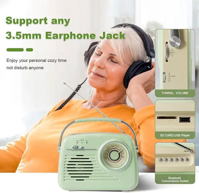 Compact and portableThis cute radios portable am fm (measuring 8.3 x 2.1 x 5.9 inches and weighing 1 pound) with a large handle for easy portability. Whether you're on a camping trip or lounging in the backyard, this am fm radio provides endless hours of fun, even in areas without cell phone reception. ^^ Multi-function PlayerBingxue vintage radios support bluetooth 5.0 connection, you can plug in your 3.5 mm headphones and AUX audio input and enjoy your personal space music. Or, simply insert an SD card or USB flash drive to play your favorite music or audiobooks.