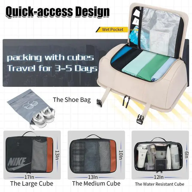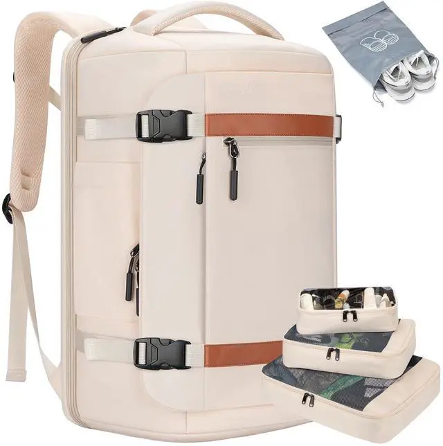 Bonus Packing Cubes: This 42L carry-on backpack includes 3 packing cubes and 1 separate shoe bag to help organize clothes, shoes, and travel gear more efficiently. The main compartment opens like a suitcase, offering large, flexible storage space for 35 days of travel ^^