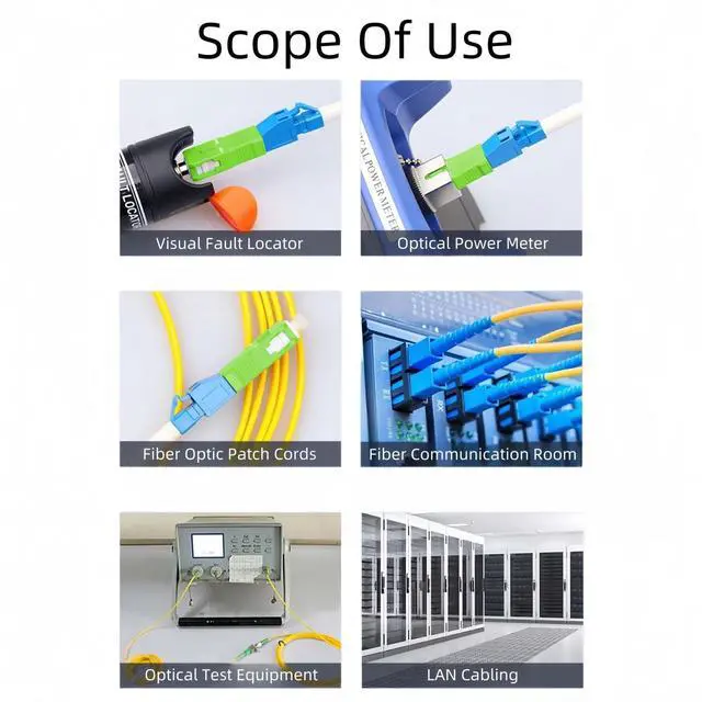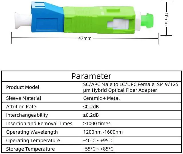 Package Includes6pcs SC/APC Male to LC/UPC Female Adapter. ^^ Compact DesignFiber connector has mini size and lightweight, making it easy to carry. ^^ Durability and PracticalityThe SC/APC Male to LC/UPC Female Adapter is constructed using durable materials and precision manufacturing techniques, enabling it to withstand multiple connections and disconnections. This results in a lifespan of over 1000 cycles. ^^ Product ParametersReturn Loss (dB) 50; Insertion Loss (dB) 0.20; Number of Mating and Unplugging Cycles > 1000 times. ^^ Widely UsedThis adapter is extensively utilized in optical fiber distribution frames, optical fiber communication networks, optical fiber broadband access networks, optical fiber CATV systems, optical fiber instrumentation, and optical fiber local area networks.